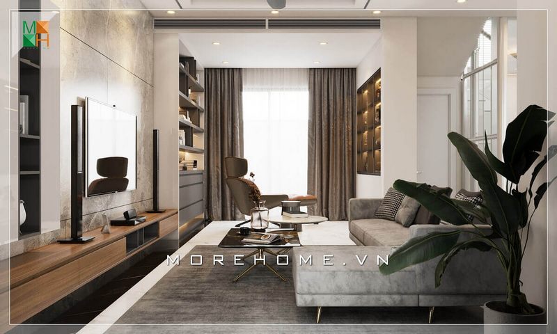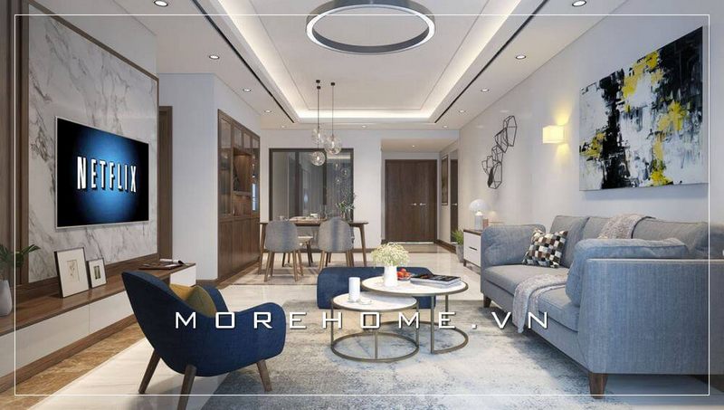 Thiết kế phòng khách chung cư hiện đại với đường nét thiết kế đầy tính thẩm mỹ và nhẹ nhàng.