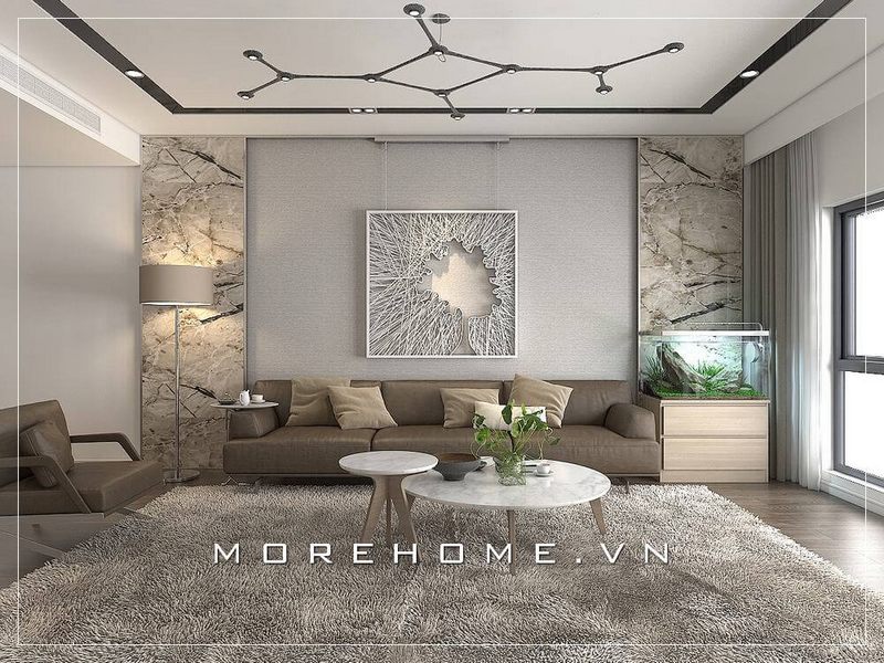 Mẫu thiết kế phòng khách chung cư đẹp với nôi thất hiện đại: bộ sofa bọc da cao cấp màu nâu sáng, bàn trà mặt đá, kệ ti vi treo, kệ trang trí mang đến không gian sống đầy đủ tiện nghi