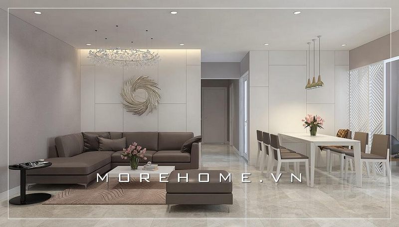 Mẫu thiết kế phòng khách chung cư cao cấp được trang bị đầy đủ tiện nghi và liền bàn ăn để phụ vụ sinh hoạt hằng ngày của các thành viên