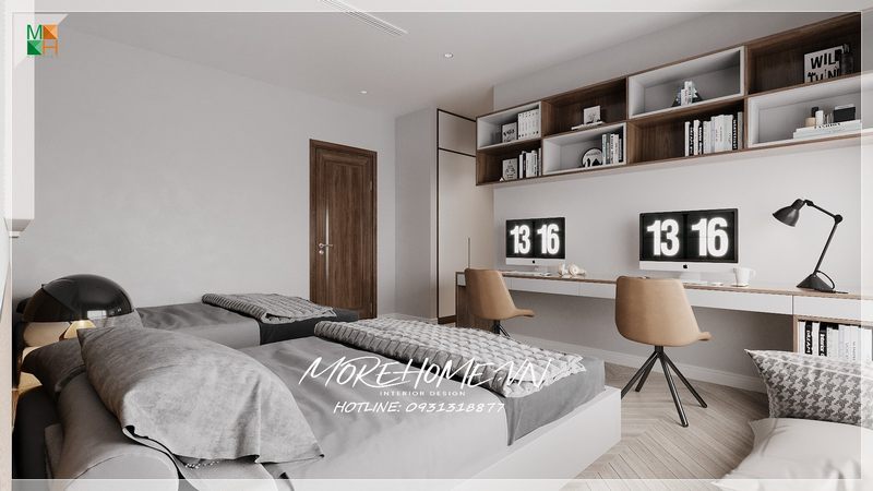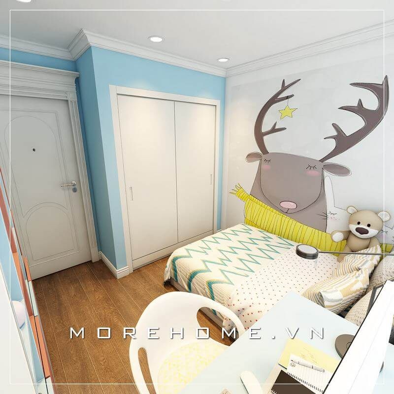 Tạo nên một không gian sống hiện đại cho bé các kiến trúc sư Morehome đã thiết kế một kệ sách treo tường bằng gỗ là nơi để những cuốn sách hay nhưng vật dụng đồ dùng cho bé giúp căn phòng gọn gàng và ngăn nắp.
