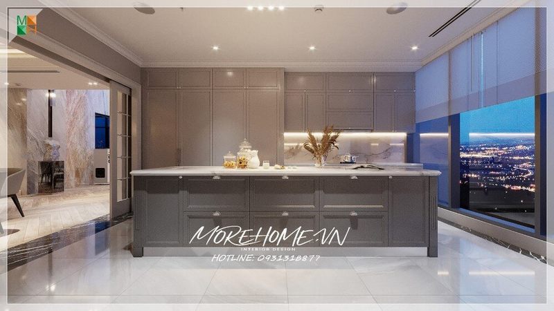 Mẫu bàn đảo bếp sang trọng bằng gỗ tự nhiên kết hợp mặt đá nhân tạo trắng vân mây