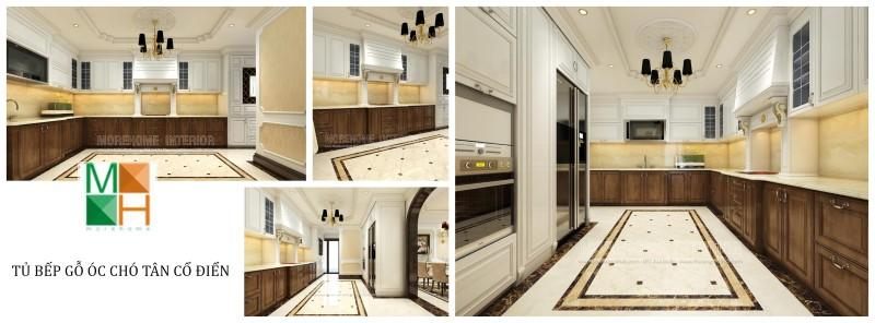 Hệ tủ bếp biệt thự được làm từ gỗ óc chó tự nhiên, kết hợp với cánh tủ kính và mặt tủ đá nhân tạo màu trắng, tạo nên một tổng thể không gian bếp tân cổ điển sang trọng.