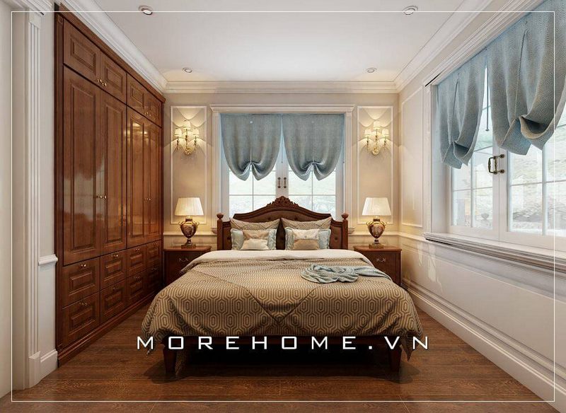 Giường ngủ tân cổ điển sang trọng với họa tiết hoa văn đơn giản, màu sắc nâu trầm nhẹ nhàng tinh tế không quá cầu kỳ sẽ tạo ra một không gian nghỉ ngơi riêng tư thoải mái nhất.