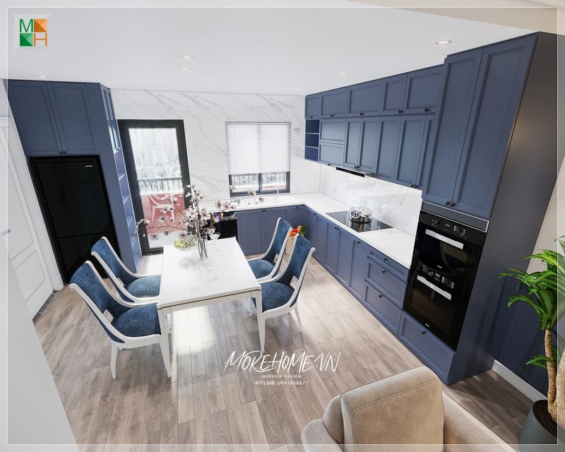 Không gian phòng bếp được trang bị nội thất gỗ công nghiệp tông màu xanh - trắng giúp tạo nên cảm giác mát mẻ.